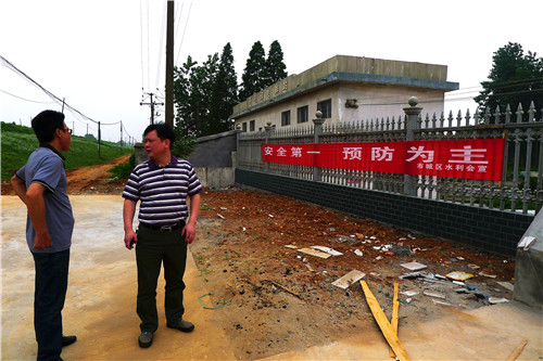 圖為市水利局長胡經緯、分管安全生產的副局長涂鴻雁及相關人員在觀看安全生產宣傳板報和工作督查