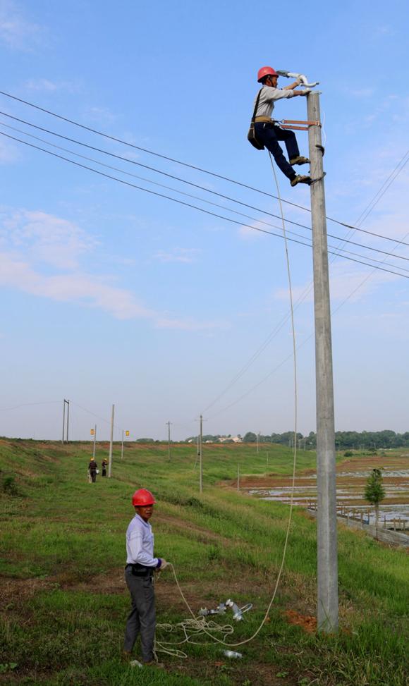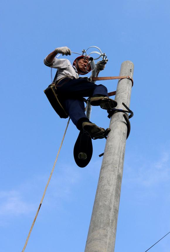 5月28日,在沅江市長春垸東線防洪大堤內坡,幾名施工人員頂著烈日,爬電桿、拖電線、架設照明設備。