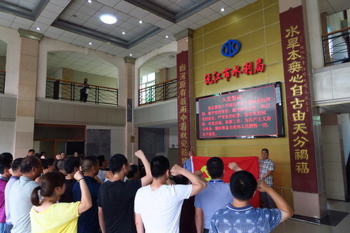 圖為市水務(wù)局機(jī)關(guān)黨員在市防指指揮大廳重溫入黨誓詞